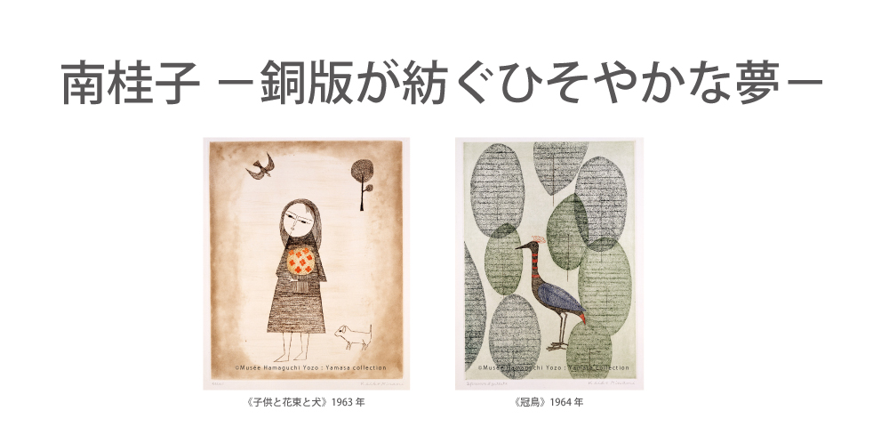 南桂子(1911~2004)は、少女や鳥、樹木などをモチーフとする詩情ゆたかな銅版画で知られています。富山県に生まれた南は、戦後上京して銅版画家・浜口陽三と出会い銅版画を始めました。1954年に浜口とフランスに渡り、パリで銅版画家として本格的に歩み出します。アメリカ生活を経て40年余りを海外での制作に費やし、エッチングをはじめとする腐食銅版画の世界を探求しました。本展では、パリ時代初期の1954年からアメリカ時代末に至る南桂子の世界をご紹介します。