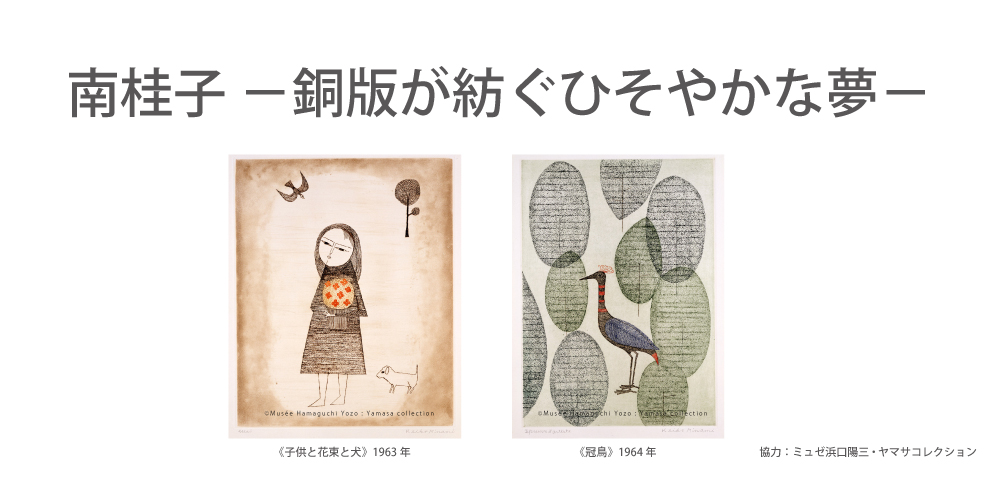 南桂子(1911~2004)は、少女や鳥、樹木などをモチーフとする詩情ゆたかな銅版画で知られています。富山県に生まれた南は、戦後上京して銅版画家・浜口陽三と出会い銅版画を始めました。1954年に浜口とフランスに渡り、パリで銅版画家として本格的に歩み出します。アメリカ生活を経て40年余りを海外での制作に費やし、エッチングをはじめとする腐食銅版画の世界を探求しました。本展では、パリ時代初期の1954年からアメリカ時代末に至る南桂子の世界をご紹介します。